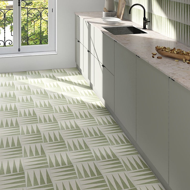 Mooie effen groene wandtegel in een spike motief. Deze groene tegel kan zowel op de wand als op de vloer geplaatst worden. Het motief kan eindeloos door worden gelegd.