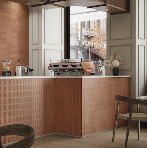 Ook heel geschikt voor een barbekleding in het restaurant of receptiebalie voor in de entree in jouw bedrijf. Met deze smalle stripes tegel vertikaal geplaatst kun je namelijk een perfecte ronding maken.