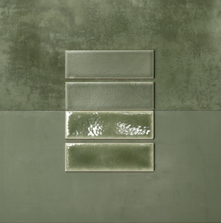 De kleur pine, een warme, natuurlijke groentint, brengt een frisse en rustgevende sfeer en accentueert het subtiele reliëf van de tegel. Deze kleur is verkrijgbaar in zowel een matte als glanzende afwerking, die onderling of met andere kleuren uit de collectie gecombineerd kunnen worden.