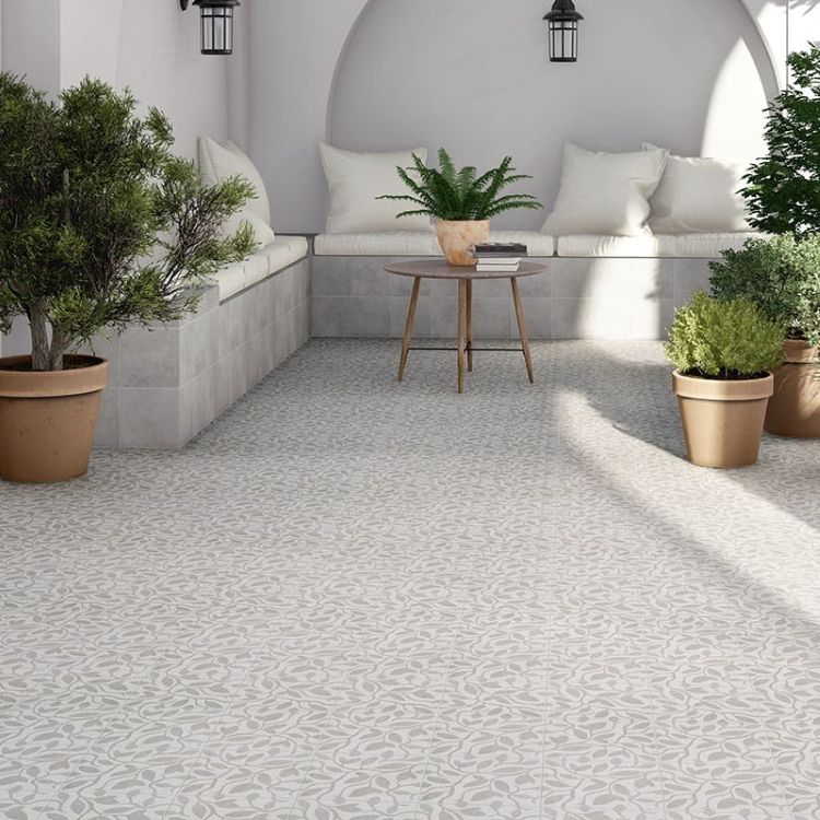 Mooie effen lichrgrijze wandtegel in een bloemachtig motief. Deze grijze tegel kan zowel op de wand als op de vloer geplaatst worden. Het motief kan eindeloos door worden gelegd.